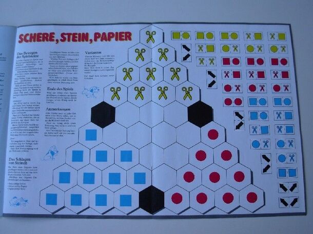 Each of the 3 players has 10 double sided playing pieces: - 3 x Rock/Scissors - 3 x Scissors/Paper - 3 x Paper/Rock - 1 king (showing Rock, Scissors or Paper on both sides) The game is played on a triangular board of 45 hexes. Each corner section of the board is reserved as staring position for the 3 players, but the arrangement of the pieces can be freely...
