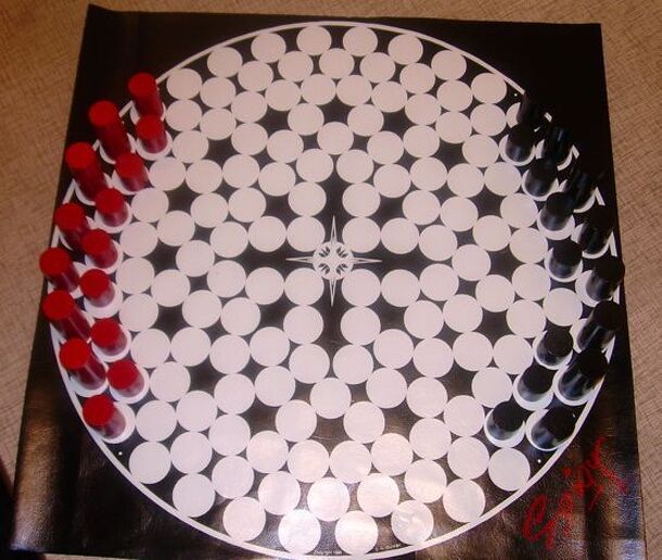 This chess-like game is played on a round board consisting of 157 circular spaces, connecting both circularly (around the board) and radially (from the outside to the center). The outer rings connect all the way around circularly, but the inner rings have gaps, requiring more complex routes to navigate. Each player has 7 Sages, 4 Stouts, and 4 Royals (one...