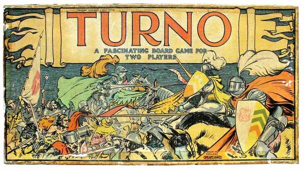 Turno consists of a hexagonal board divided into 96 triangles, with two players arranging thirty pieces (four cannons, eight bowmen, and three knights each) on their starting positions as marked on the board. Each piece has a red side and a gold side; players pick a color prior to starting and place their pieces with their chosen color facing up. Players...