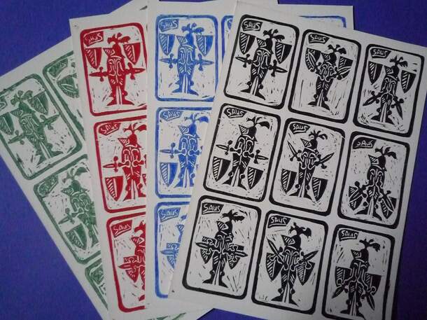 Simple card game about a knight's tournament. Each player plays a knight card, the cards are simultaneously revealed and everyone compares results with each other knight on the table. The knight cards hold a sword and a shield, either up, middle or down. A sword that points somewhere without protection of either kind scores three points (head), two points...