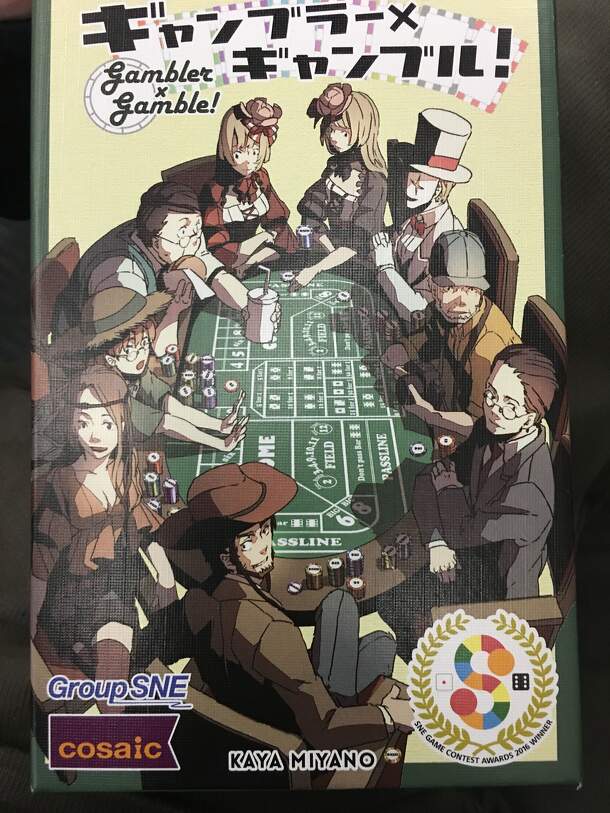 Gambler × Gamble! is a simple card game that won the "Group SNE Contest" in 2015 and published by COSAIC in 2016. Players begin the game with two gambler cards face up in front of them, two number cards (0 and 1) in their hands, and two coins in their treasury. As the game progresses, players will hire more gambler cards, receive larger number cards, and...