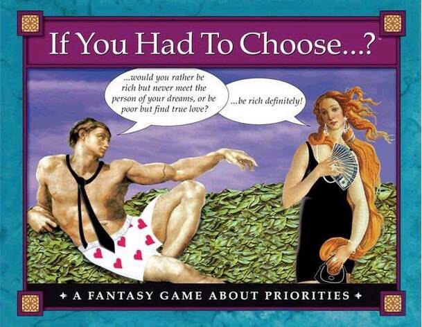 If You Had To Choose...? A FANTASY GAME ABOUT PRIORITIES TM If you had to choose... would you rather (A) be breathtakingly beautiful but have to go to prison for five years, or (B) always be plain looking but never go to jail? If you had to choose... would you rather be stuck in a one room cabin for two weeks during a severe snow storm with (A) George...