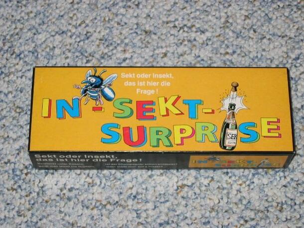 Game from the same series as e.g. Patron-Ow and Ham-N-Ex etc. Start of each round a small bottle of champagne (without champagne of course...) and a bug each are hidden beneath one out of four miniature champagne coolers. Player chooses one cooler and turns it over - if it's the champagne or nothing he scores some points and may continue if he wants. If he...