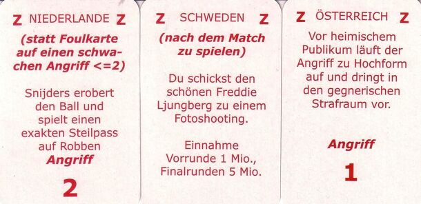 Millionen von Schwalben is a (fairly satirical) soccer-themed game. Each player manages several soccer teams in a world championship tournament, trying to become rich. Matches are played with cards and die rolling, and different teams have different abilities. The action and country cards allude to many real-life events in soccer. Even though team success...