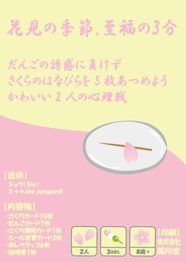 In さくらだんご (Sakura Dango), you want to collect five sakura cards or get your opponent to collect three dango cards — but who will collect which cards will be determined by both of you The first player in a round takes the deck of ten sakura cards and seven dango cards, then chooses three of them and places them face down in an arrangement. The other player...