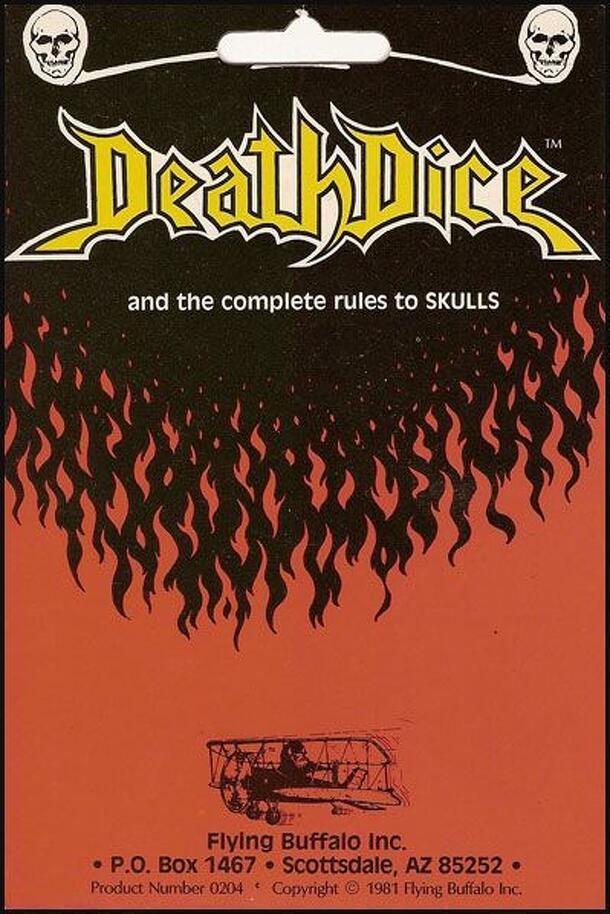 Quoted from the back of the package Copyright 1981 Flying Buffalo Inc.: Skulls A game for any number of people Required: two "Death Dice", paper and pencil This game is played in six rounds. The object is to get the highest score after six rounds. Each of the two dice has number on five of the six sides, and a skull on the sixth side. Determine which...