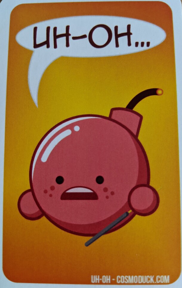 This is Uh-Oh, the 1-card game. Minimalist, fun and addicting party game, Uh-Oh plays for 3 to an unlimited number of players, starting around 6 years old and for games of around 5 minutes (maybe a bit more if you are 25 people around the table playing). How to play: Freely define the first player, who places the card on its Yay! side in front of him/her....