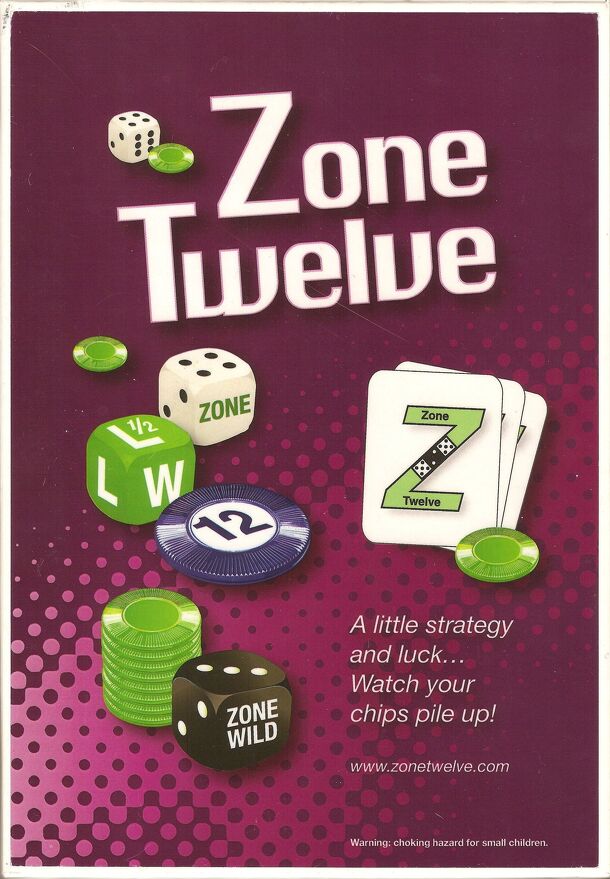 Zone Twelve is a dice game for 3-6 players with some elements of gambling and lots of luck. A game consists of 5 rounds plus one bonus round. One game takes about 15 minutes to play. On each turn a player rolls the three dice and tries to get the dice to add up to 12. Two of the dice are 0-5 (one side is labeled "Zone") while the other die is 2-5 with a...