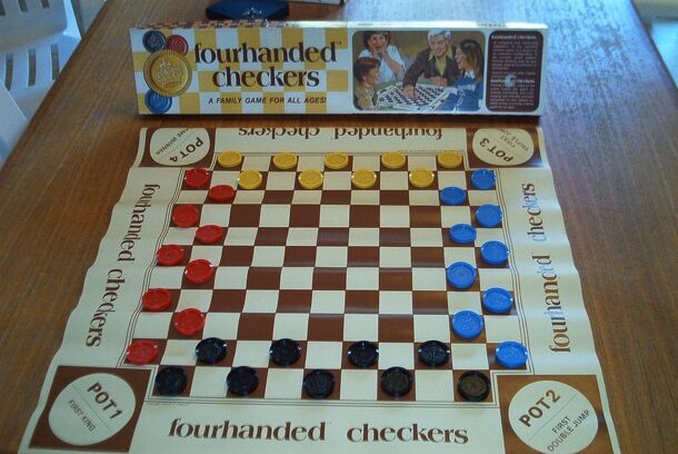 Uses 9 instead of 12 checkers for up to 4 players, either in teams or individually. Has 4 pots (1,2,3 & 4) for first king, first double jump, first triple jump and winner. This is an interesting 4-player variant. The 4 pots add to the interest if filled with something of value or even titles, i.e. "King of the World". Quick and unpredictable game with the...