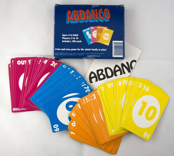 Players play a card face up, matching the color, number, or word on a card in the middle. Stop, Out, and Take One cards modify the play. When a player plays the last card from his hand, the others must count and score the remaining cards in their hand. Hands continue until 2,000 or more points are reached, and that person is the loser. The player with the...