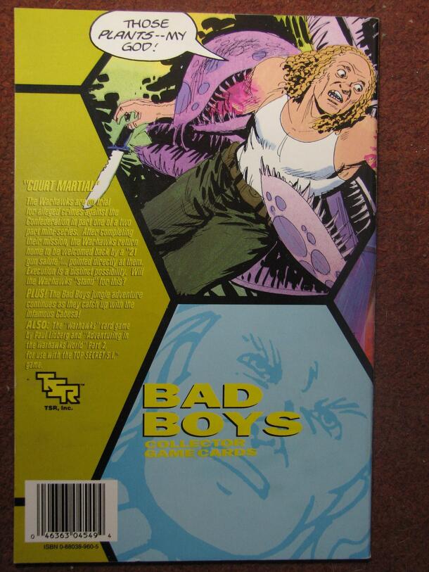 This was one of the games published in TSR's "Comics Modules" - it appeared in Warhawks Comics Module #5, which is called Warhawks 2050 Part 1 on the cover. It consists of a deck of 24 cards depicting characters, places, and objects from "Bad Boys," the backup feature in the Warhawks book. These are used to play two games, one (not given a separate title)...