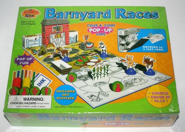 Barnyard Racing begins as a craft project. The 3-D board is decorated and colored with markers and rubber stamps that are provided. On the completed board, players race their animals around the board by drawing a card and moving the number of spaces indicated. When a picnic space is reached, the player chooses a stamp from a selection of face down stamps...