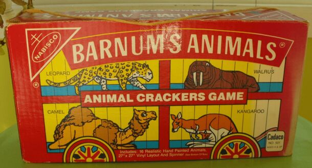 "Fun and excitement for players of all ages FROM 4 AND UP!" Another game in a giant Animal Cracker box, this one published by Cadaco not Mattel/Fisher Price. Object: Be the first to move your four animals from the circus ring into your four cages. No reading required, just spin and go. [Although one spinner wedge is marked: "Return one animal to ring if...
