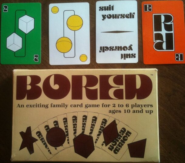 BORED is a card game where players seek to make sets of cards: Three or more of the same number and diffeerent colors; Three or more of the same color and consecutive numbers; Five letter cards that spell out B-O-R-E-D. Shape cards and instructional cards alter the flow of play or the construction and value of sets. The long-term goal is to earn the five...