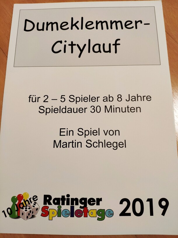 The Dumeklemmer-Citylauf was a promotion game for the Ratinger Spieletage 2019 board game convention in Ratingen, North-Rhine-Westphalia, Germany. The players have to move on a map and visit different sights in the city of Ratingen. At the start of the turn the player perform a dice roll to get action points according to the number of dice pips, which can...