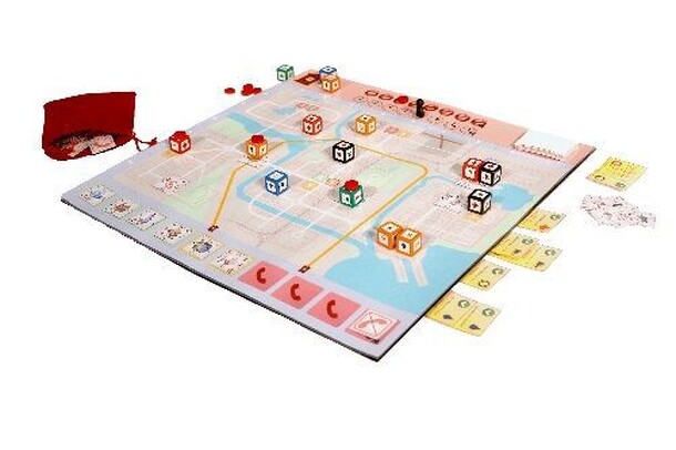 The board shows a city with lots of high buildings between which the players roll and move. When a player pawn reaches a black field, the player can look at the top face-down tile next to it and keep it if so desired. If not, he/she puts it back on top of any stack. When a player rolls a 6, he/she can demand a tile from another player who has four tiles or...