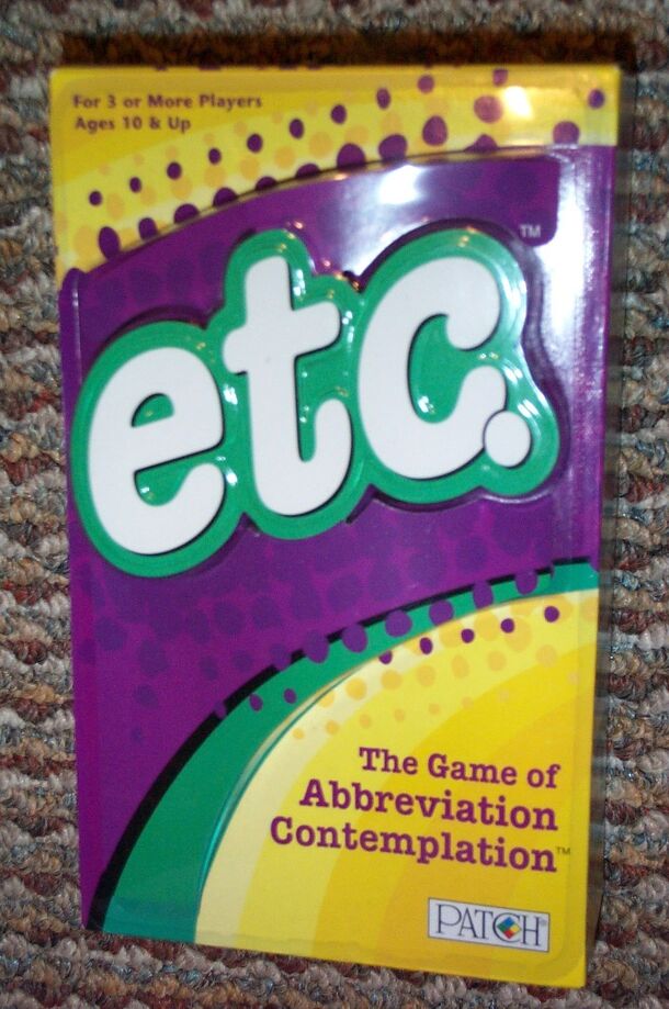 etc. : The Game of Abbreviation The reader will give you a letter combination... like DH, and a clue. It is up to you to solve the clue, and if you do, you get the points, which are scattered across the table. For example, if the letter combination is "DH", the clues read might be: 1. A miniature dwelling for toy people (Doll house) 2. He bats but doesn't...