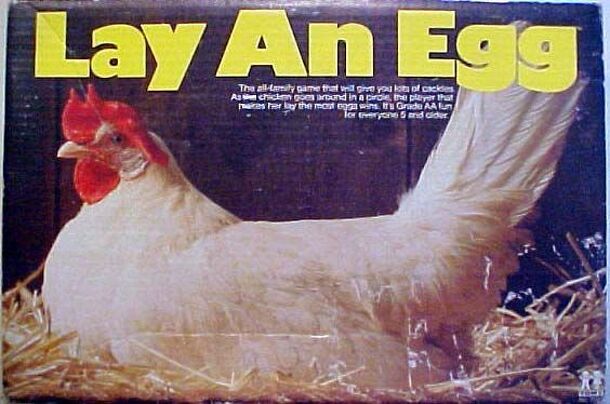 From the box: The all-family game that will give you lots of cackles. As the chicken goes around in a circle, the player that makes her lay the most eggs wins. It's Grade AA fun for everyone Ages 5 and up As the chick approaches your egg basket you push a button to make her lay an egg. If the player times his push right the chicken will swivel its rear and...