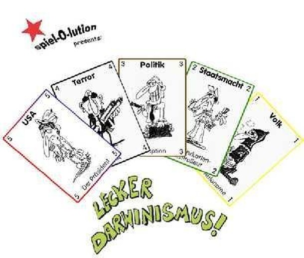 Lecker Darwinismus is a satirical game where players play sets of 3 card on the table representing the people, politics, terrorists and the USA. By playing actions cards of one type higher, players try to win sets played by the other players. In the end, players score for card won from other players plus the sets collected they still own. The illustrations...