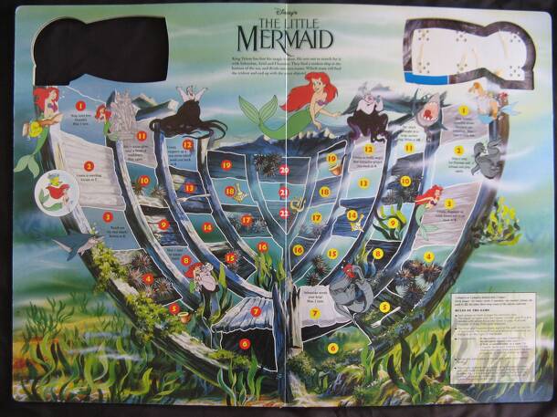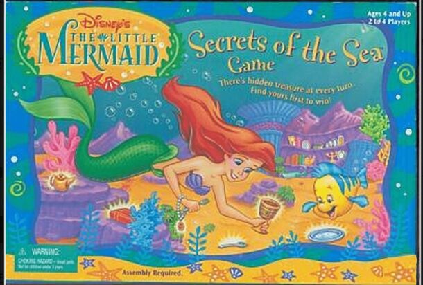 King Triton has lost his magic trident. He sets out to search for it with Sebastian, Ariel and Flounder. They find a sunken ship at the bottom of the sea, and divide into two teams. Which team will find the trident and end up with the most objects? Published in Disney's Giant Board Game Book, The Little Mermaid is a roll-and-move game where players must...