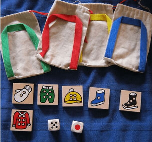 Very simple game for the very young. Each kid has a rucksack which can hold six items (wooden cubes with pictures), corresponding to die rolls. The kids take turns rolling dice, trying to get different things to put into the rucksack. When a kid rolls a result that is already in his or her rucksack, it can be given away to another player. The game is that...