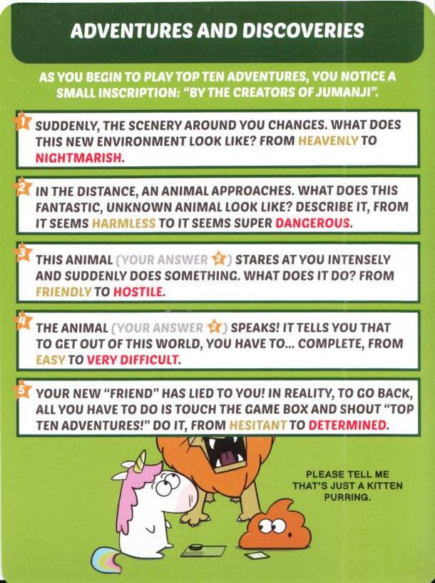 In-ten-sify your own adventure! Top Ten Adventures is a standalone game in the Top Ten universe. Here, you play one of the 80 exhilarating adventures, revealing its 5 questions one by one. The principle of the game is the same: a question is read aloud, and everyone gets a card showing a number from 1 to 10. All players come up with their answers, and the...
