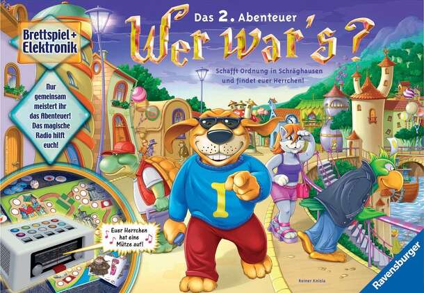 In Wer war's? Löst das Rätsel von Schräghausen!, a sequel to the Spiel des Jahres-winning children's game Wer war's? by Reiner Knizia, an electronic device is once again added to the board game. Players are co-operating against an evil goblin who has caused chaos by making everyone forget everything: Farm animals no longer know who their master is, and...