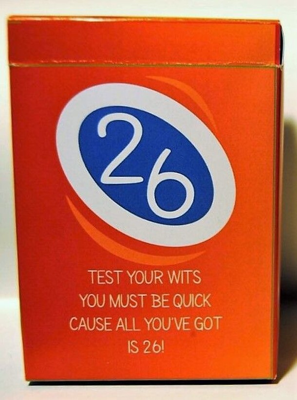 26 is a competitive, fun, team-based card game. Players will divide into two or more teams. After determining which team will go first, one team will draw a letter card and the other will draw a topic card. The team holding the topic card announces the topic and the team with the letter card has 26 seconds to name as many topics as possible that start with...