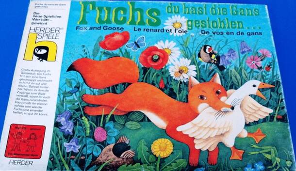 Cooperative children's game. A fox is trying to escape to the woods with a goose as prey, the players try to prevent that. There are several "exits" where the fox can escape unless a certain minimum number of player pieces block them. Players can donate their rolls to other players. If a fox symbol is rolled, the fox moves forward. If the fox escapes...