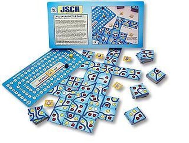 [From the publisher's web site] The JSCH (pronounced “Ish”) from faraway Planet Erra observe the struggle between Good and Evil Forces on Planet Earth. Which will gain influence over the Minds and Souls of Humans? JSCHWJSCH/JSCHRJSCH mean Kings and Queens of Wisdom in the Plejaran language. The players help each other by clever laying of tiles to make Maps...