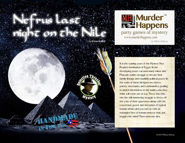 Murder Mystery Party Game Ancient Egyptian Murder mystery party game for 8-12 players that you host at home. Each player dresses up as a character, one is the murderer and the rest must figure out who that is. To solve the mystery there are clues, police report, crime scene photos, and a map. You go over these materials then question all the players about...