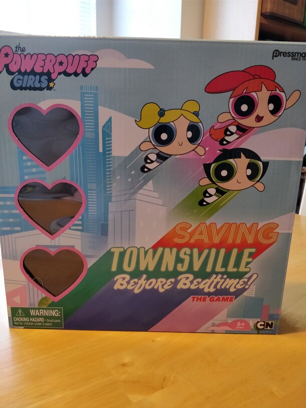 Watch out! Townsville has been taken over by villains and only the Powerpuff Girls can help! This is a cooperative game where the players will work together to move the Powerpuff girls around the board to uncover villains to fight. Each Powerpuff Girl can fight alone (using the dice with erasable sides) or can work together to fight stronger villains. But...