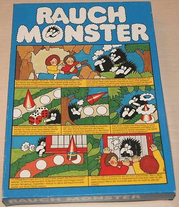 Objective: throw out all smoking monsters which have invaded (y)our home (cave) - or - enter the cigarette slot machine before all monster puzzles (20) are gone - moving by turn - decide which die to use (3 red spaces = tough one) roll the die and - let the monster puzzle grow (if red) or - move as fast as you can from your cave to the slot machine; on...