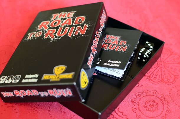 The Road to Ruin co-operative card and dice game for 1 to 4 players. The Road to Ruin is set in the aftermath of a zombie infection outbreak that has left the city overrun by hordes of unstoppable zombies. Each player controls a survivor of the outbreak. On their turn, the players move their survivor around hidden locations, revealing each location and the...