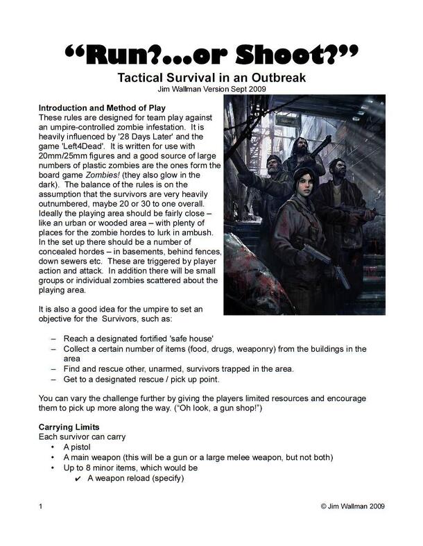 From the rulebook: "These rules are designed for team play against an umpire-controlled zombie infestation. It is heavily influenced by '28 Days Later' and the game 'Left4Dead'. It is written for use with 20mm/25mm figures and a good source of large numbers of plastic zombies are the ones form the board game Zombies! (they also glow in the dark). The...