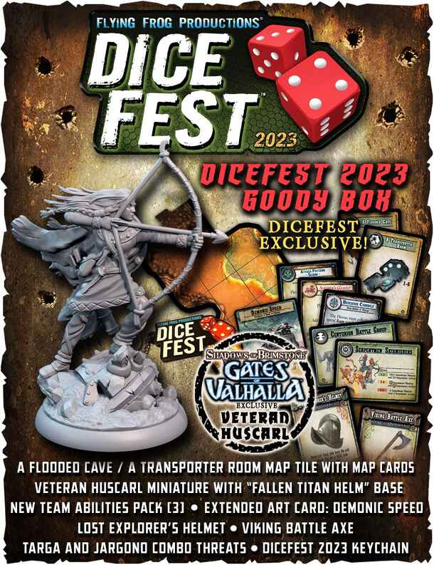 You can purchase the DiceFest 2023 Goody Box only during DiceFest Weekend and only on the FFP Web Store! Includes: A Flooded Cave / A Transporter Room Map Tile with Map Cards DiceFest-Exclusive Veteran Huscarl Miniature with “Fallen Titan Helm” Base New Team Abilities Pack (3) Extended Art Card: Demonic Speed Lost Explorer’s Helmet Viking Battle Axe Targa...