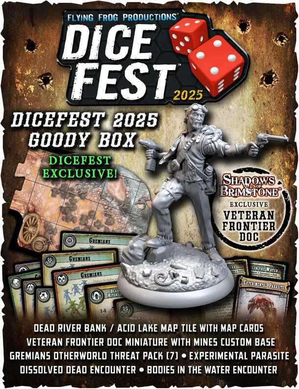 You can purchase the DiceFest 2025 Goody Box only during DiceFest Weekend and only on the FFP Web Store! Includes: Exclusive Veteran Frontier Doc Thermal Plastic Miniature on Custom Mines Theme 30 mm base Dead River Bank (Canyons) / Acid Lake (Blasted Wastes) map tile Map Cards for this new tile Gremians OtherWorld Threat Pack (7 cards) Experimental...