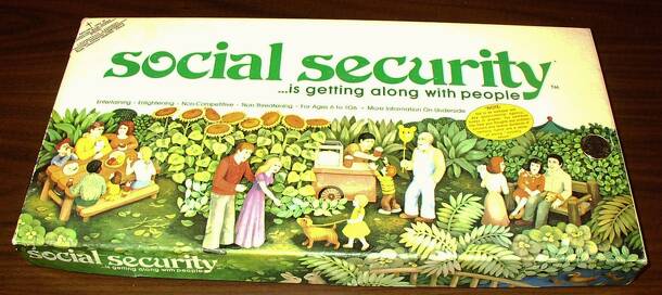 From the rules: "SOCIAL SECURITY is a new, novel, non-competitive game for family, classmates, church groups - or for any 'happening'. SOCIAL SECURITY consists of a game board, six kinds of cards, a spinner, pawns, and a die. Players, from six year olds to grandparents, will find themselves stretching their imaginations and practicing new communications...