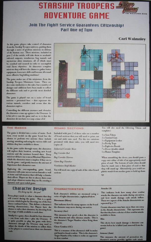 This game was presented in the pages of the free online magazine Signs and Portents ( numbers 40 , 41 and 42 ) , available on the Mongoose Publishing website. The game is an adventure/light RPG game played with miniatures from the Starship Troopers line.Similar to Space Crusade , the game pits 4 classes of marines against 13 species of bugs , on a square...