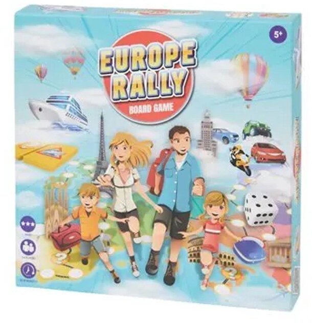 Europe Rally is a race in Europe. On the way, ferry crossings are waiting for us, for which we need a ticket-card with the appropriate color of the ferry. Cities with unpleasant surprises like the prison in Rome and numerous surprise fields with question marks. In a round we have a choice of two moves. We can roll the dice and move the number of points...