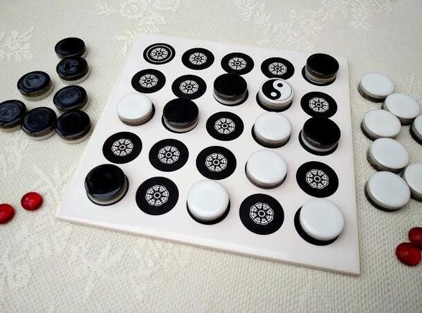The game is played on a 5x5 spaces board with 25 double sided pieces. The first player takes 13 playing pieces and 2 flip gems and the second player takes 12 playing pieces and 3 flip gems. There are no pieces on the board to start. On their turn, the player must place a playing piece showing their color on the board on any open space. Other than being...