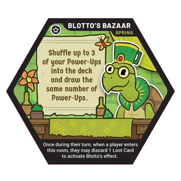 This promotional Heroes of Barcadia Blotto's Spring Bazaar Room Tile is available as a Gift With Purchase when you buy the 2026 Spring Booster Pack. Not available for individual sale. While supplies last. A player entering the special Blotto's Bazaar room tile may discard 1 Loot card to shuffle up to 3 of their Power-Up cards into the deck and draw the...