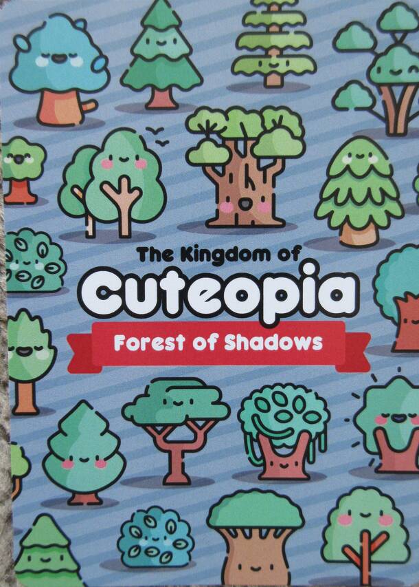 This is a stand-alone sequel to Kingdom of Cutetopia. Unlike the former, which was draw-one-card, play-one-card, Forest of Shadows involves exploring an 8x5 grid of forest cards to find 7 treasure cards, defeat monsters, and battle other players, similar to a dungeon crawl. Each player is dealt 5 item cards, then 7 cards are removed from the Forest deck...