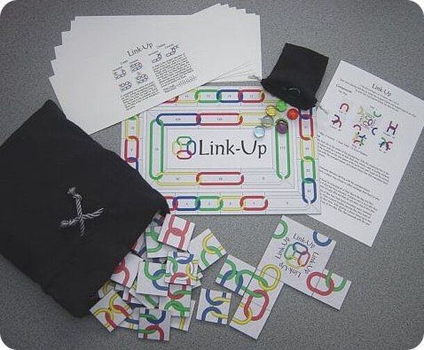 Link-Up is a tile placement game for 2-6 players ages 6 to adult that takes 60 to 90 minutes to play. Every Link-Up tile has up to four open chain links. Each of these links may be one of the four link colors: red, blue, green, or yellow. A player has a pool of up to five tiles that they keep hidden from other players behind a screen. On their turn, a...
