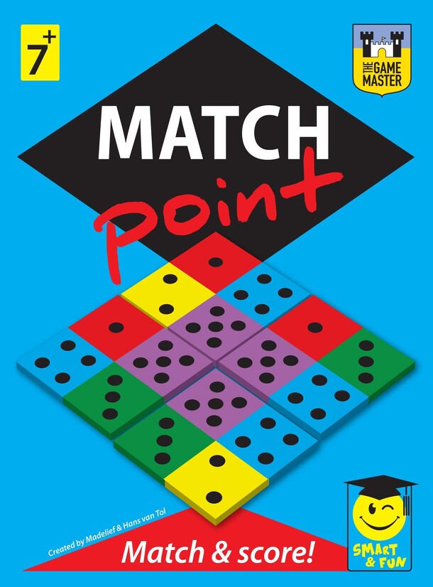 In Matchpoint, the first title in The Game Master's "Smart & Fun" game line, players take turns placing one of two tiles in hand onto the playing area, turning the tile this way and that to determine the best way to earn the most points. More specifically, each tile is comprised of four colored quadrants, with each quadrant having a number of pips: purple...