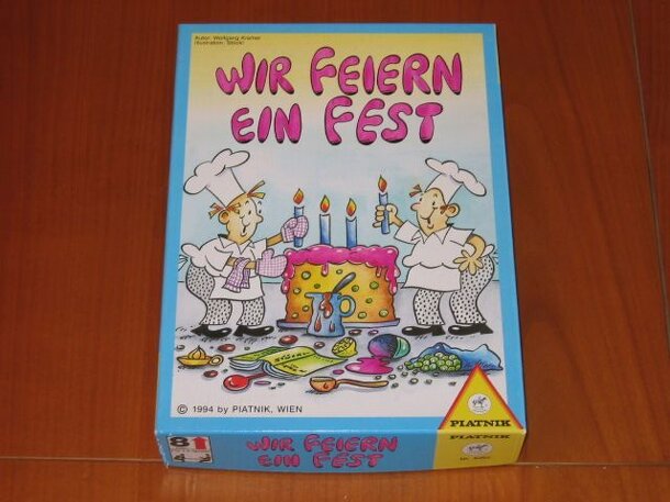 Lets get ready to party. But before all the eating and drinking stuff has to be prepared... The 48 tiles (printed on both sides) are laid out in an 6x8 grid. The active player has to switch 2 tiles so that afterwards more tiles with the same picture are next to each other. The number of the connected tiles is the points you score. A nice unfortunately...