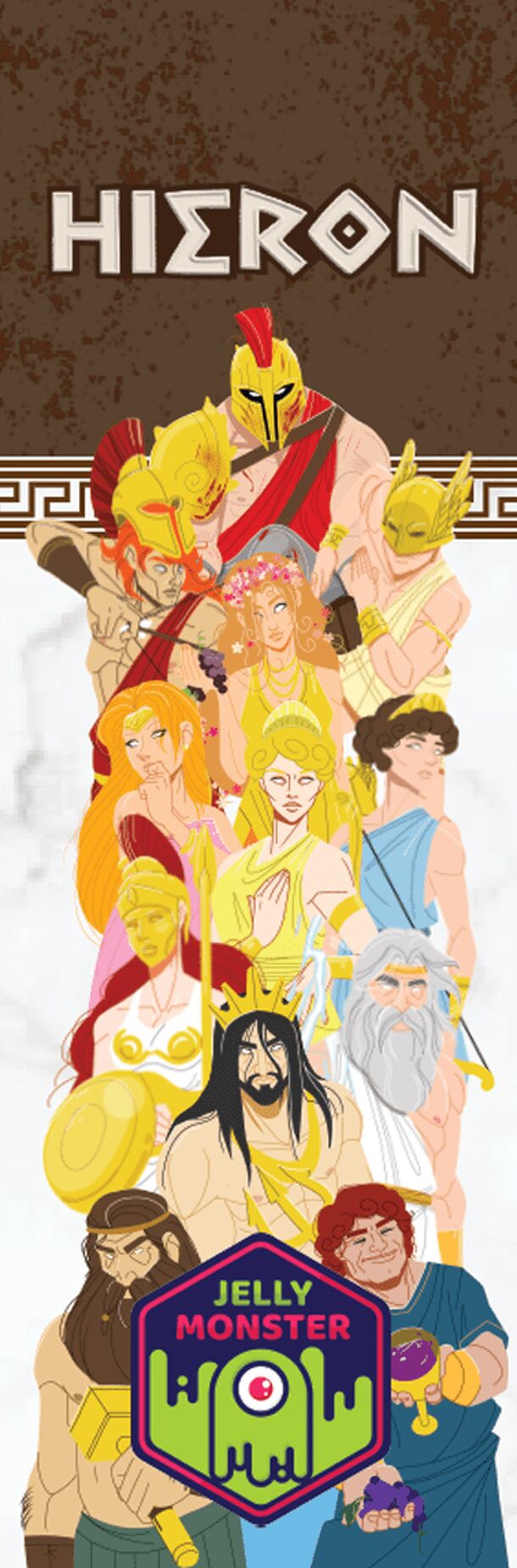Hieron is a cooperative game in which players work together to win the favor of the 12 Gods of Olympus. Each deity has their own preferences, accepting different offerings at their temples and, throughout the game, Heroes appear to help with the missions. Each turn the player must play an offering card in one of the Gods' temples that has the same number...