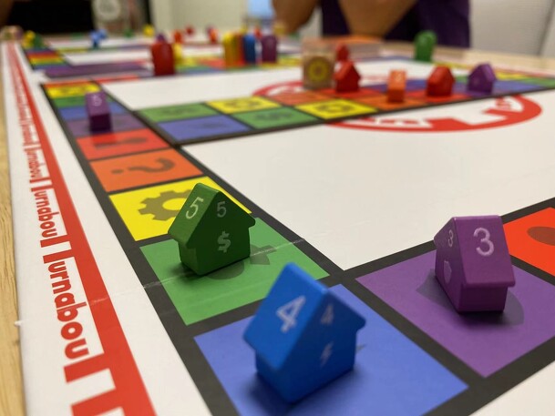 A race around the board to collect five posts for victory! Each different coloured player piece has different abilities or advantages... Green (AKA The Banker) starts the game with three times the coins as all their opponents. They also collect three coins instead of one each time it lands on the green square. Yellow (AKA The Shopkeeper) can hop over traps...