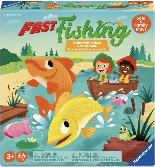A Dice-Rolling Race Downstream! Excitement ripples through the water as fish and fishermen race to the sea! Roll the die to determine your move: will you help a fish swim closer to safety, or will you advance the fishermen's boat, bringing them closer to their catch? The goal is simple but full of suspense—save as many fish as possible before they’re...