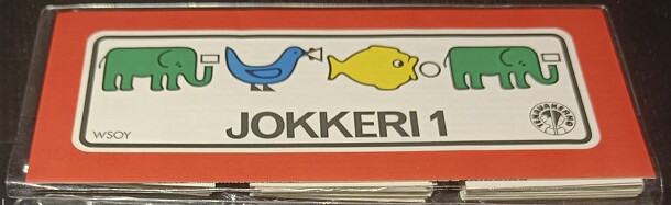 Jokkeri 1 consist of Domino-type cards with shapes (square, triangle or circle) or animals (elephant, duck or fish) in four colors (red, blue, yellow or green) on them. At the start of the game all cards are delt evenly to players. One player declares one card in his/her hand the matching card needed: "Who could find Big red elephant to accompany my little...